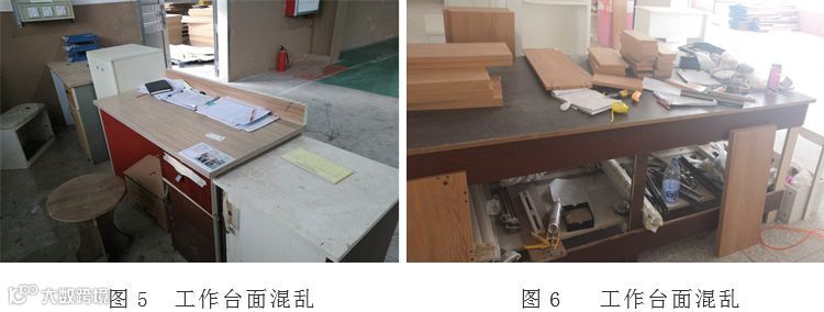 因为车间员工工资是计件方式,员工对自己日常使用的表单及辅助工具缺乏管理的意识,基本都是随手丢放,造成工作台面混乱(如图5,图6),有时候因为找工具或表单而导致了时间的浪费,设备的空转。不但企业资源上存在浪费现象,对于员工来说,产量没上来,工资自然就少了。