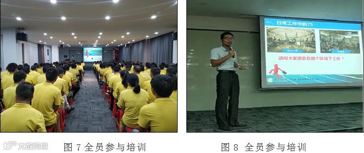 全员参与培训(如图7,图8),采用课堂培训与现场指导相结合的方式。让工厂上下都知道7S到底是什么?7S是哪些方面的体现?应该怎么做?做成什么样的效果?只有先对预期结果有一定的认识,行动才有明确的方向。在全员宣导的会议上,对与会人员逐一解析7S的含义和动作的呈现,同时也将日常的例检工作和整改方式跟大家说明,只有认识到7S的整体运作流程,才能使员工更好地配合领导小组实施现场7S改善相关的动作。
