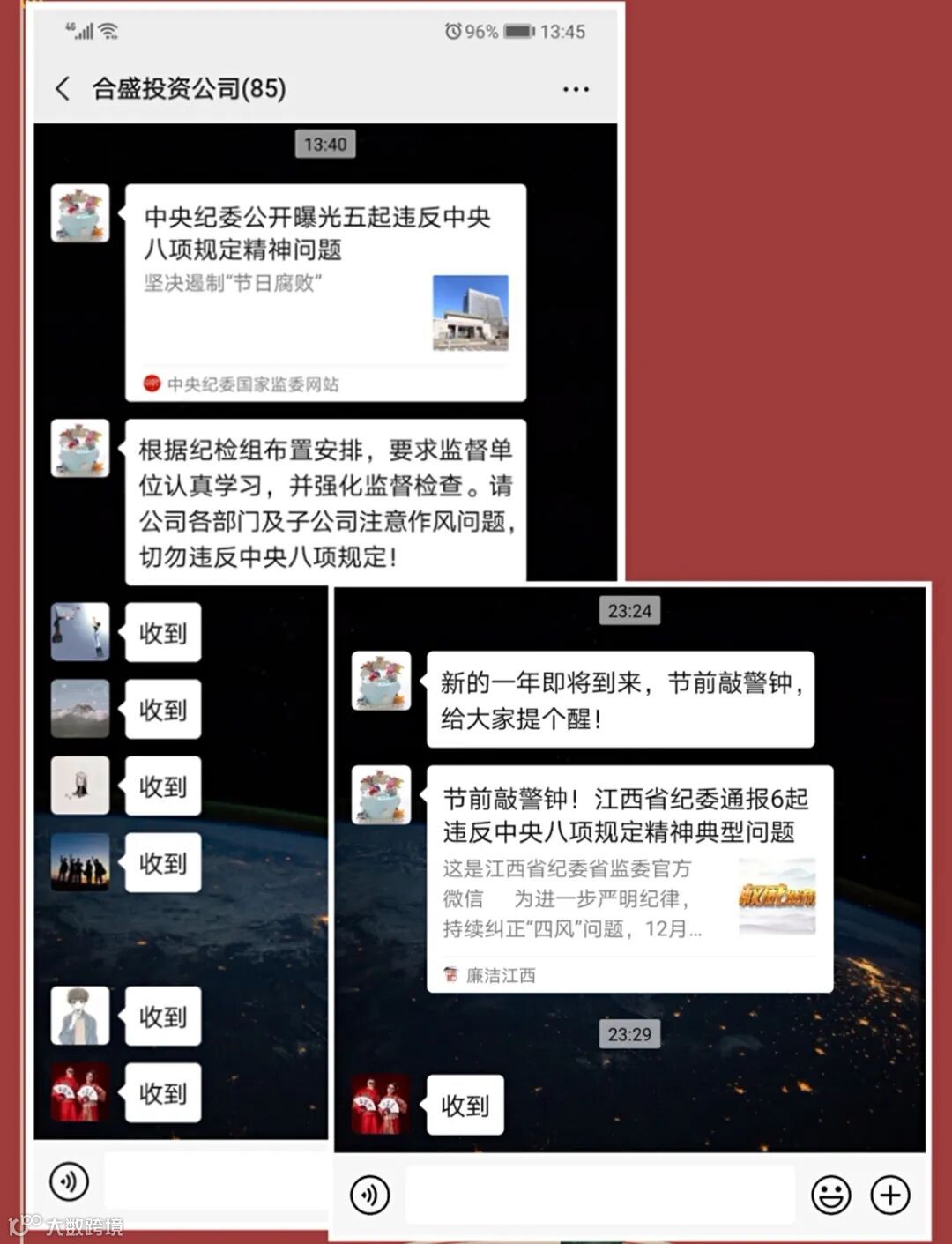 为牢固树立全体干部员工的纪律和规矩意识,合盛公司创新纪律教育形式,利用OA办公系统、微信群、公众号等灵活多样的学习方式,提醒干部职工、特别是党员干部认真遵守各项规定要求,强化作风意识,确保学习入脑入心,营造风清气正的工作环境。