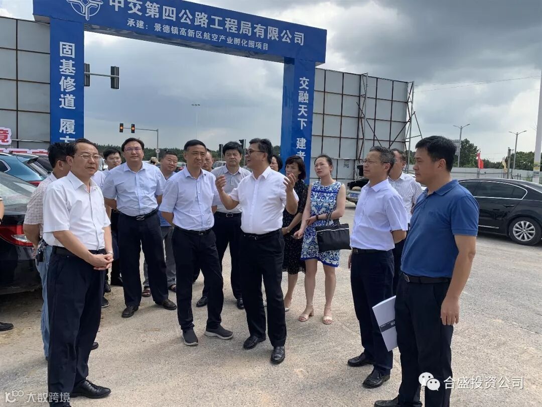 7月18日下午,景德镇市委副书记、市长刘锋,市委副书记王前虎,副市长孙鑫,市委副秘书长张小力,市政府副秘书长程曙光,区党工委书记廖云东一行顶着烈日,来到景德镇合盛产业投资发展有限公司航空产业孵化园项目工地实地调研指导工作,合盛公司董事长吴林,总经理邓景扬陪同调研。
