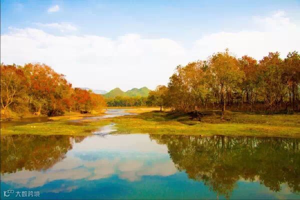 或许你经常去阳朔徒步漓江,但却从未到过乌桕滩。乌桕滩在漓江边上的一个大江滩,江滩上有一丛丛的乌桕林。每逢秋冬时节,树叶红透,三五处红叶,清澈的漓江流水,宛若一幅诗意盎然的水墨画。