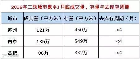 3、二线城市中,苏州、南京和合肥的库存量分别为450万、549万和332万平方米,而1月的成交分别高达121万和135万和86万平方米。但是与几个热点的二线城市相比,一线城市依然相形见绌,尤其是苏州、南京和合肥,去库存周期都已经低至4个月。