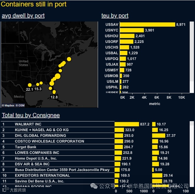根据维兹昂API的数据显示,受影响最大的公司是沃尔玛,在东海岸和海湾沿岸的港口都有集装箱,在港口有837.2TEU,平均停留时间超过10天。