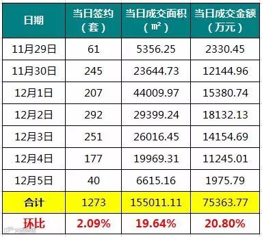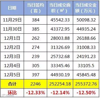 另外根据数据监控,上周(11月29日—12月5日)东莞新房住房成交2246套,环比上周下降12.33%,成交面积为252254.18平方米,环比下降12.14%,总成交金额达到255372.76万元,环比下降12.5%。