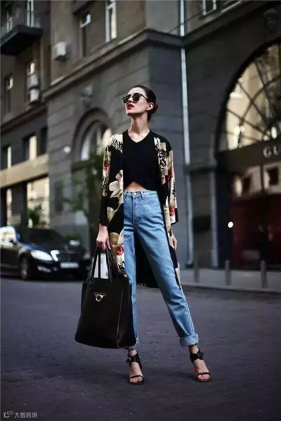 右面的直筒牛仔裤不仅将腿型修饰的笔直,而且搭配红色的高跟鞋也很有气质~