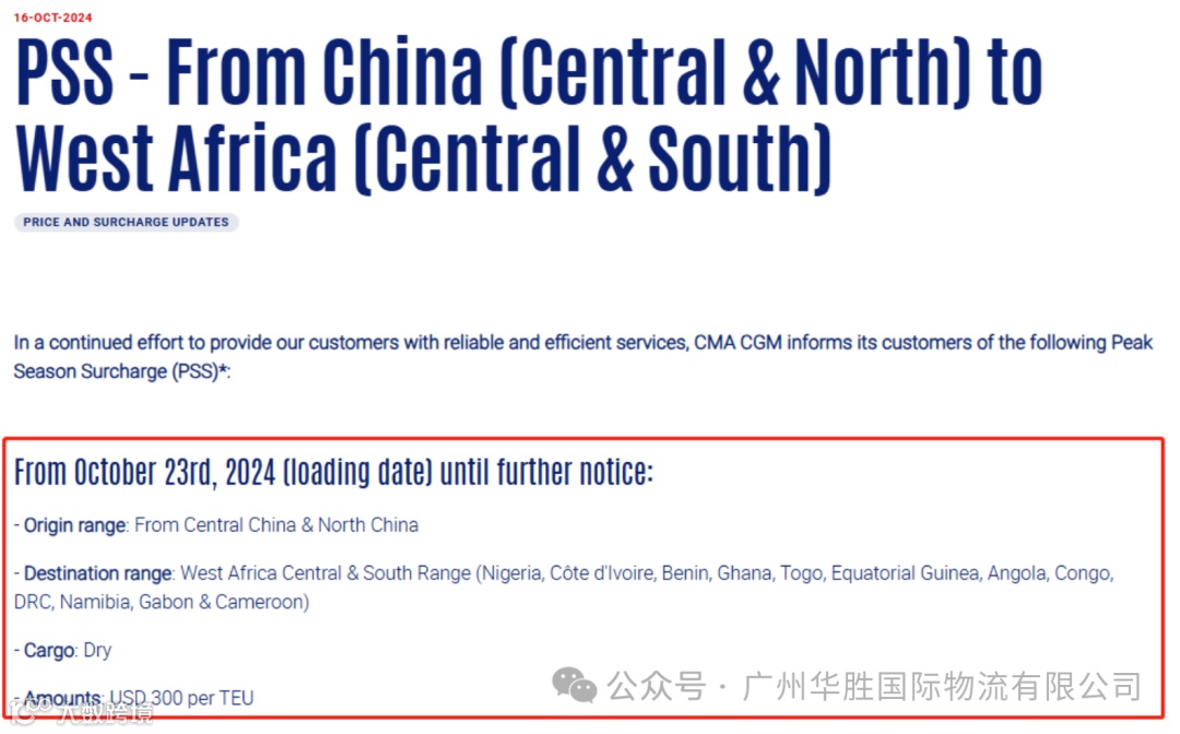 在这之前,达飞宣布将从2024年10月23日(装货日期)起,对从华中和华北至西非中南部山脉(尼日利亚、科特迪瓦、贝宁、加纳、多哥、赤道几内亚、安哥拉、刚果、纳米比亚、加蓬和喀麦隆)的干货征收旺季附加费(PSS),具体为300美元/TEU,直至另行通知。