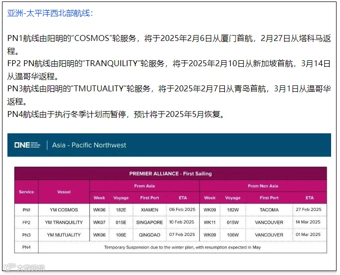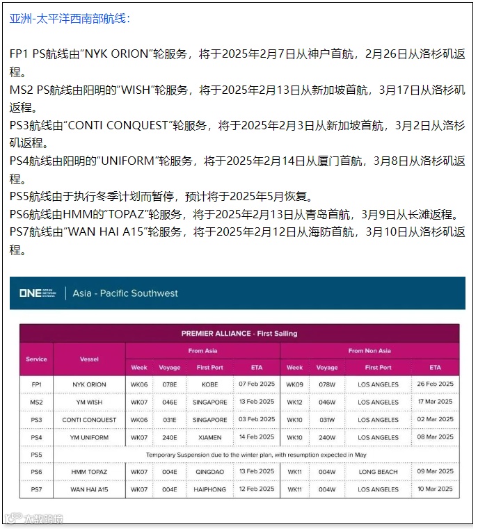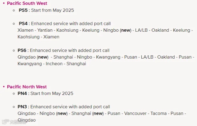 此外,三家船公司还同时发布了,Premier Alliance的PS5和PN4服务将延至2025年5月启航。根据ONE的消息,在PS5和PN4航线延后开航期间,将调整服务覆盖范围,新增PS4、PS6和PN3航线的停靠港口。