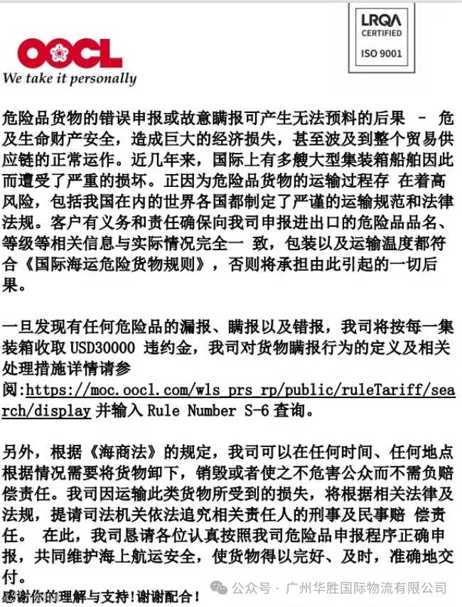 东方海外在公告中特别强调:一旦发现有任何危险品的漏报、瞒报以及错报,将按每一集装箱收取 USD30000违约金。