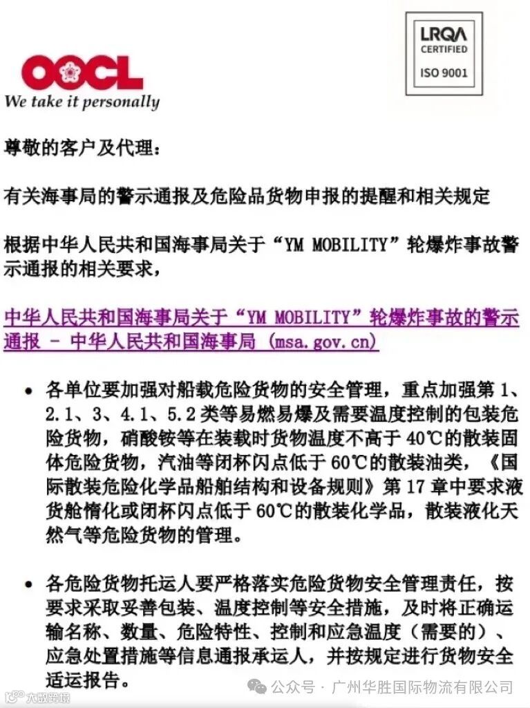 值得注意的是,就在这起集装箱起火事故发生的三天前,也就是8月12日,OOCL东方海外就曾发布有关海事局的警示通报及危险品货物申报的提醒和相关规定。