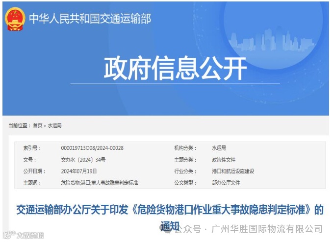为贯彻落实习近平总书记关于安全生产的重要论述,深入排查治理危险货物港口作业重大事故隐患,根据《中华人民共和国安全生产法》《中华人民共和国港口法》《危险化学品安全管理条例》《港口经营管理规定》《港口危险货物安全管理规定》等有关法律法规规章和标准,我部组织编制了《危险货物港口作业重大事故隐患判定标准》,现印发给你们,请遵照执行。执行中的重要情况,请及时向部水运局反映。