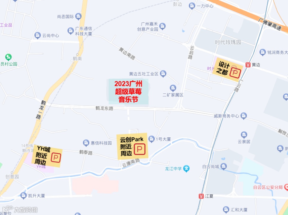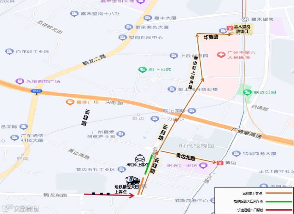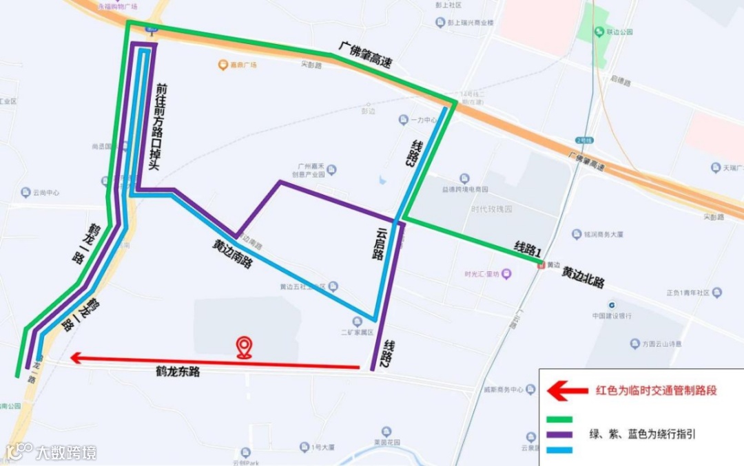 2.由黄边北路前往鹤龙东路西段方向需经云启路至黄边北路或黄边南路绕行至鹤龙一路前往,或直接绕行广佛肇高速辅路前往。