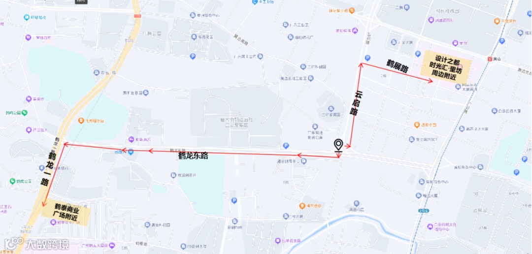 1.由鹤龙东路东段前往鹤龙东路西段方向需经云启路至黄边北路或黄边南路绕行至鹤龙一路前往,或直接绕行广佛肇高速辅路前往。