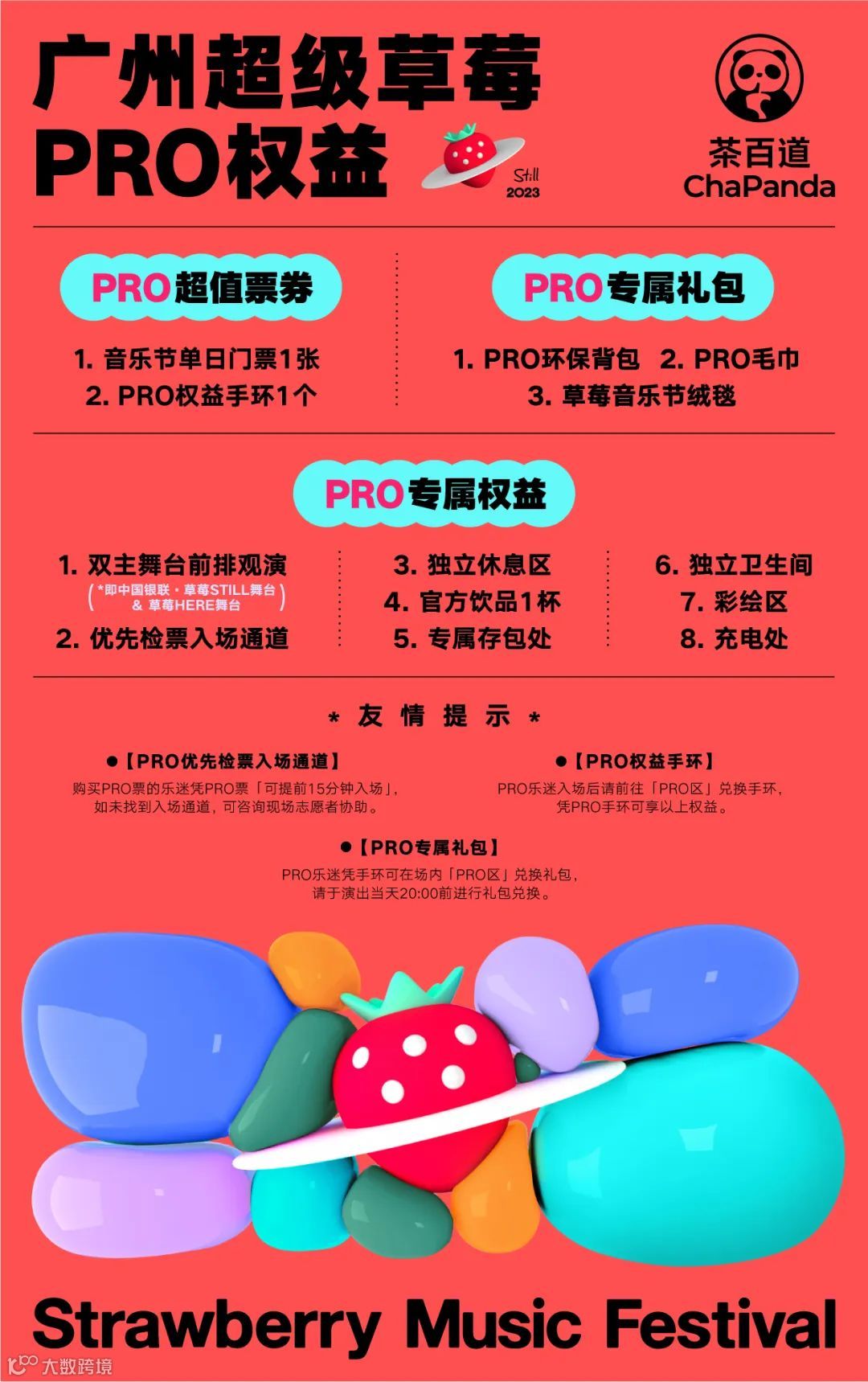 PRO单日票:含音乐节单日门票1张,以及专属礼包、专属权益。(专属礼包:PRO环保背包、PRO毛巾、草莓音乐节绒毯;专属权益:双舞台前排观演、独立休息区、优先检票入场、官方饮品1杯、专属存包、独立卫生间、充电处、彩绘处。)