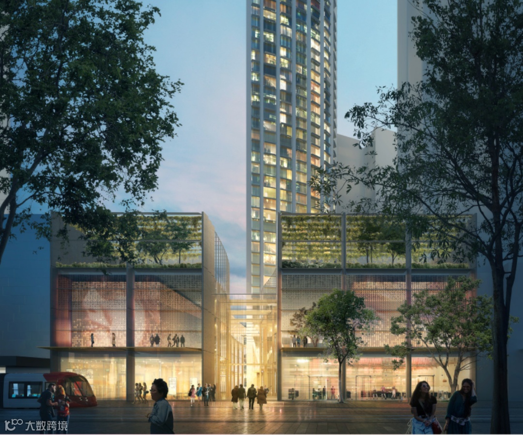 以“well-connected public”哲学,在建筑的入口处,设计一个被挡风玻璃围合的小广场,与现有的环境高度融合,以提供一个友好自在的公共空间。