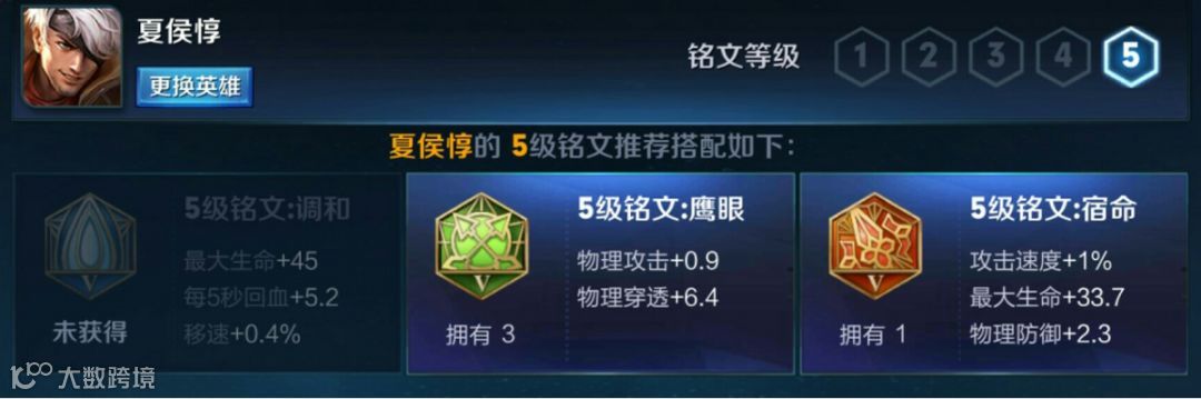 夏侯惇是一个典型的坦克英雄,红色宿命提供攻速和生命物理防御;蓝色铭文调和补充移速和生命回血,更加方便于支援游走;同时绿色鹰眼补足一些伤害。