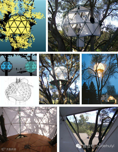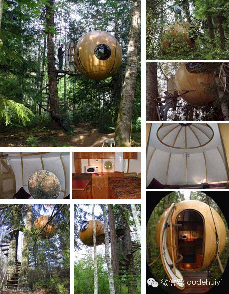 这种灵活耐用,看上去有点奇怪的书屋是------球形树屋,一种可以悬挂在树上、建筑物上和岩石表面的一种树屋。带子和绳索把球形树屋坚固的吊在那里。整个球体只需要四处定位点就可以牢固的锁定。每个球形树屋外部都是防水盒抗冲的,内部是一层胶合板,外层是玻璃纤维。
