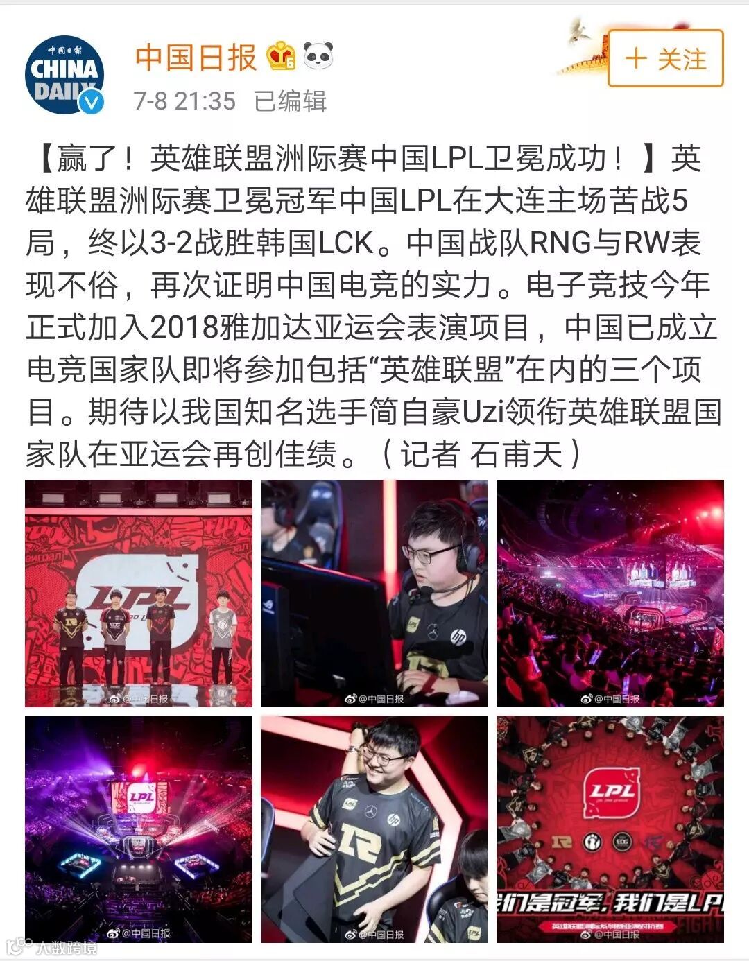 还有一个好消息,“中国日报”表明,电子竞技今年正式加入2018雅加达亚运会表演项目,中国已经成立电竞国家队。