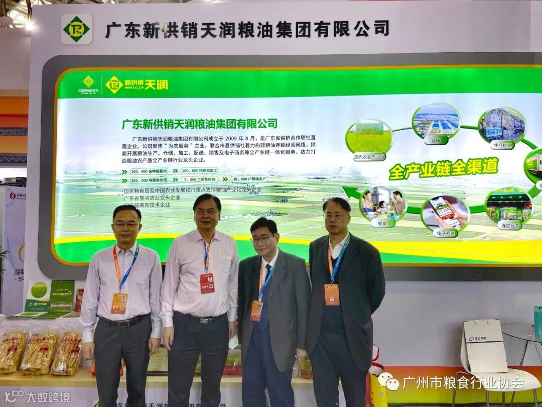 本届粮食交易大会,广东展区主题是“弘扬特区精神勇担南粤粮食物资安全新使命”。广东报名参会的各级粮食和物资储备部门及企事业单位超过200家、人员超过600人,参展企业超过40家。广东省粮食和物资储备局肖晓光局长、吴津伟副局长、广州市发改委邓宏永副主任、广州市储备粮管理中心郭志健主任等省市领导,亲临广州市粮食集团有限责任公司、广东新供销天润粮油集团有限公司、广州增城区新塘粮食管理所、广东友粮粮油实业实业有限公司、广州市番禺粮食储备有限公司、广东省广垦粮油有限公司展位视察指导。期间,广东新供销天润粮油集团有限公司与河南辉县市金穗粮油有限公司签订了5万吨小麦的销售意向协议。