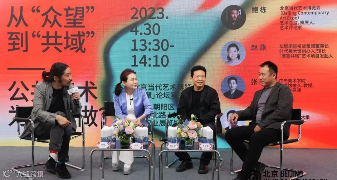 4月30日下午,华熙国际投资集团董事长、时代美术馆馆长赵燕受邀参与“北京当代·艺术博览会——重聚”论坛,作为“感官共域”公共艺术项目的发起人之一,赵燕与北京当代·艺术博览会创始人鲍栋、中央美术学院美术馆馆长张子康、“感官共域”参展艺术家杨茂源一同围绕“从众望到共域——公共艺术为谁而做”主题展开圆桌对谈,探讨公共艺术中的“公共性”是什么、核心价值如何呈现以及公共艺术未来的发展趋势等问题。