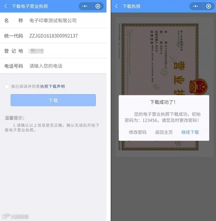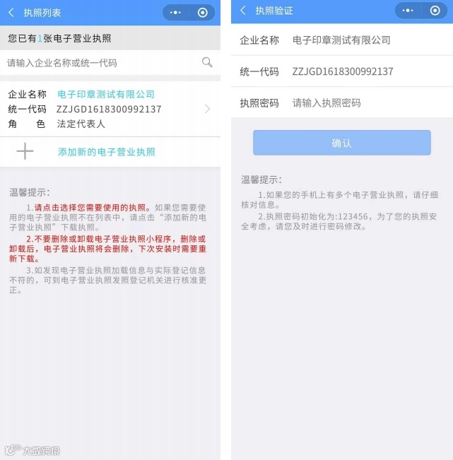 第三步:选择需要领取印章的电子营业执照,并输入执照密码进行验证。