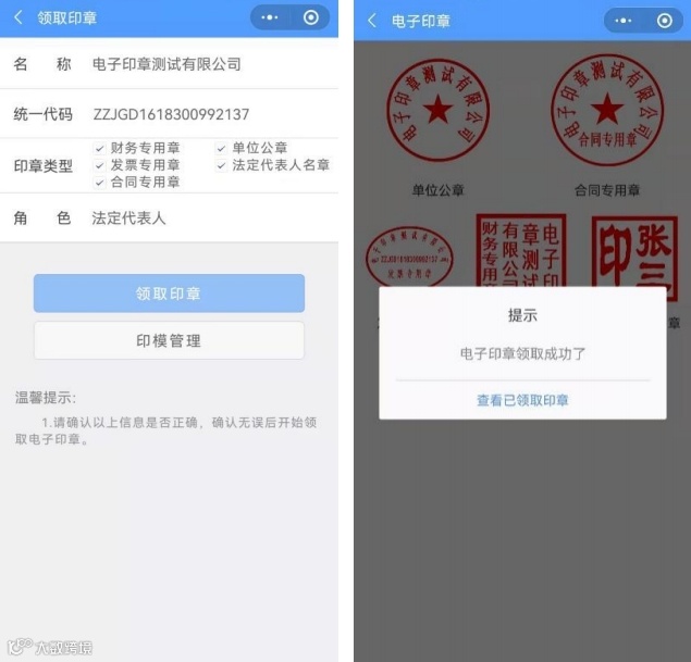 第五步:跳转印章领取页面,核对企业信息无误后点击“领取印章”,领取成功后将展示该企业的电子印章。