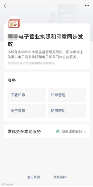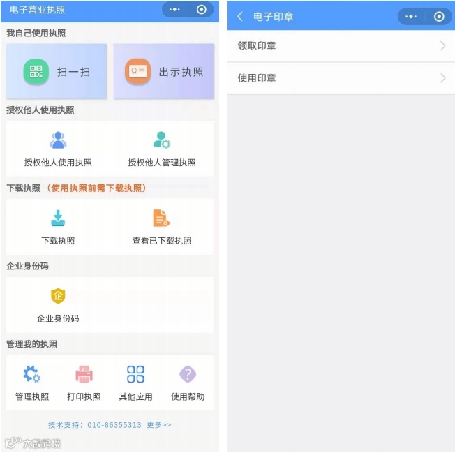 第二步:在“电子营业执照”小程序中,点击首页“其他应用”,选择“电子印章>领取印章”。
