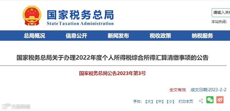 2月2日,国家税务总局发布《国家税务总局关于办理2022年度个人所得税综合所得汇算清缴事项的公告》。公告明确,年度汇算时间为2023年3月1日至6月30日。(在中国境内无住所的纳税人在3月1日前离境的,可以在离境前办理。)