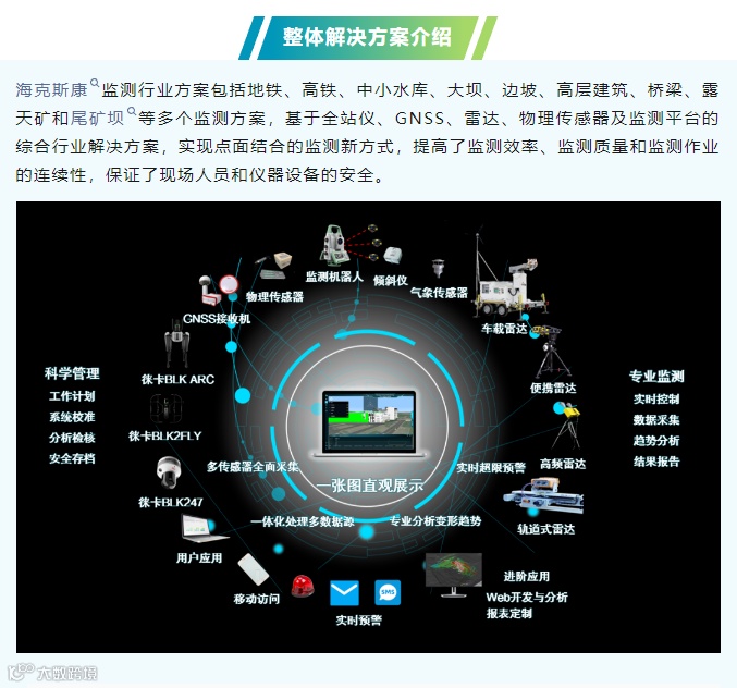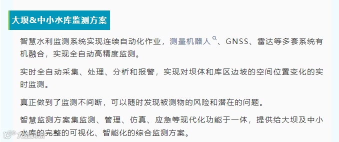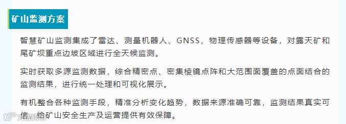 全自动采集监测数据,处理并分析变形的发展情况,实现可视化监测、一张图全要素展示,及时发出险情预警,避免重大损失,保障安全生产。实现点面结合的监测新方式,提高了监测效率、监测质量和监测作业的连续性,保证了现场人员和仪器设备的安全。