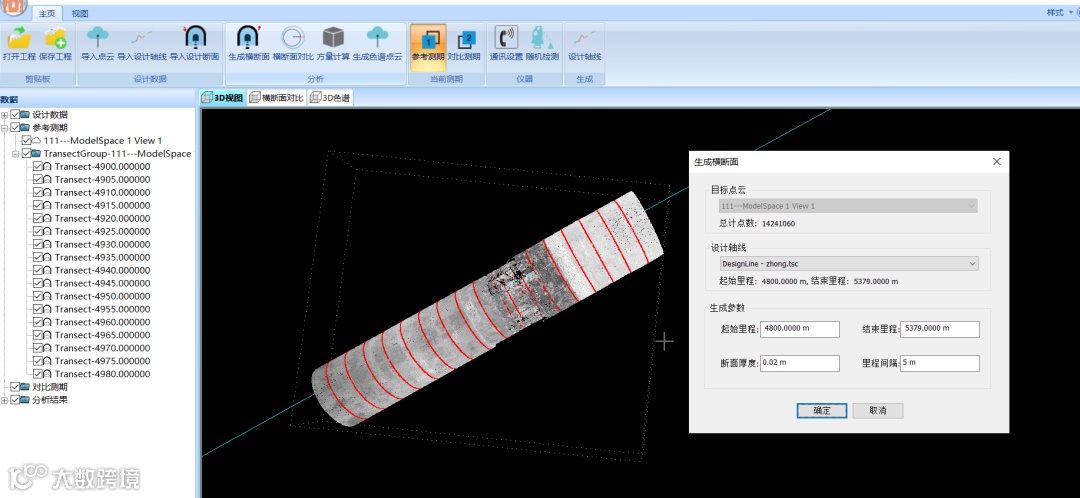 3.1断面提取:在HDS隧道施工测量软件中依次导入设计轴线、设计断面、隧道点云,指定需要计算的始末里程,以及断面间隔,一键自动批量提取断面,也可以提取任意指定位置的断面。