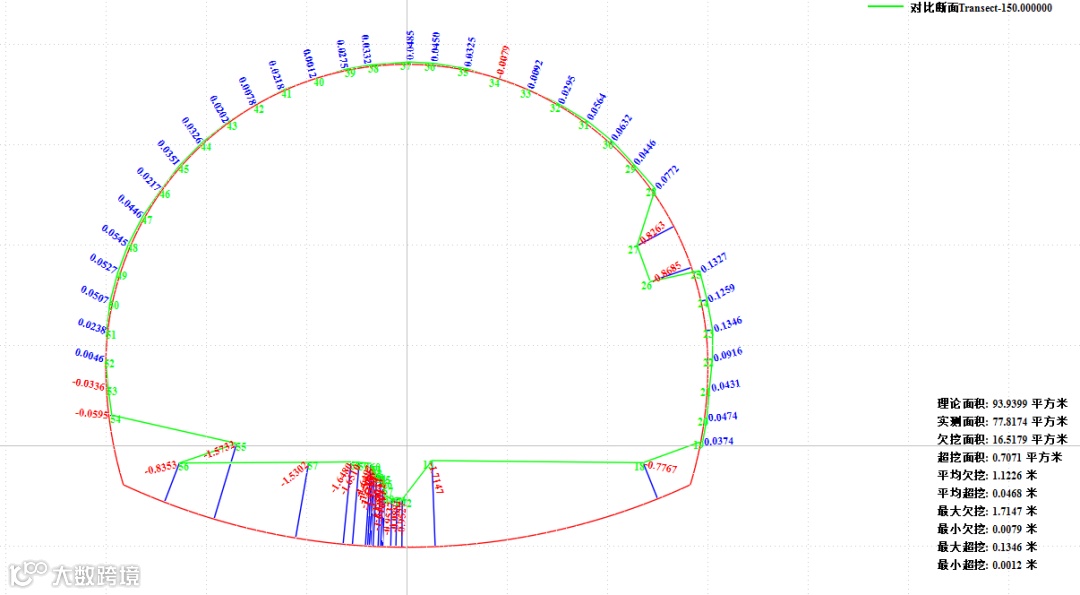 3.2超欠挖分析与方量计算:指定参考断面,选择一个或多个测量断面进行横断面对比,生成超欠挖对比图,一键自动计算区间超欠挖和二衬方量