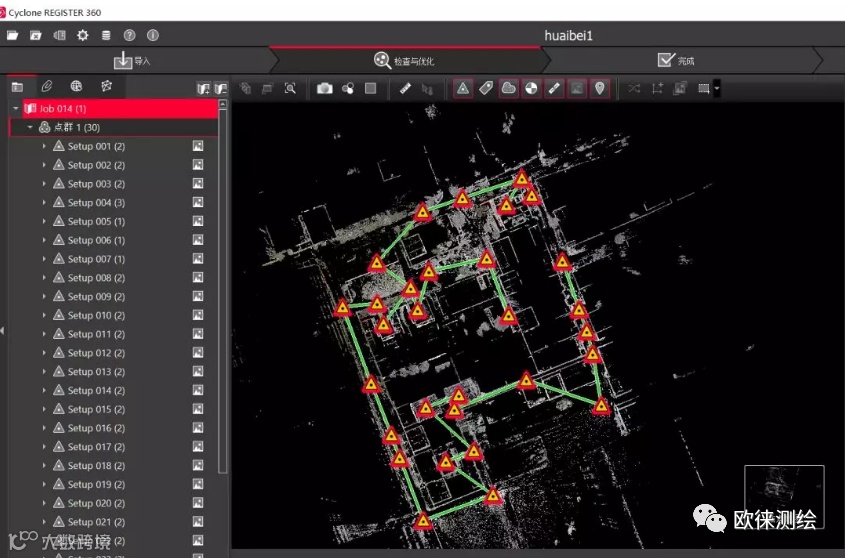 导入结束后,全部点云已经自动拼接好。检查拼接精度,构建闭合环,优化点云整体拼接精度,优化后,点云拼接精度在5mm以内。