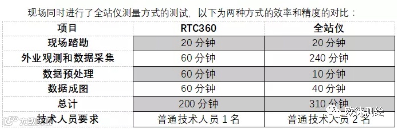 现场同时进行了全站仪测量方式的测试,以下为两种方式的效率和精度的对比: