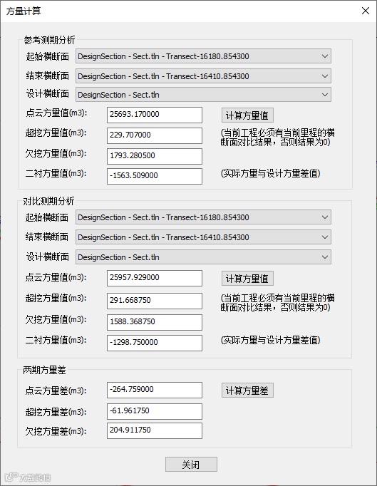 选择任意里程的一个或多个断面和标准设计断面对比,得到超欠挖对比图与对比分析,可导出DXF数据、EXCEL报表、图片、文本等多种形式的成果。