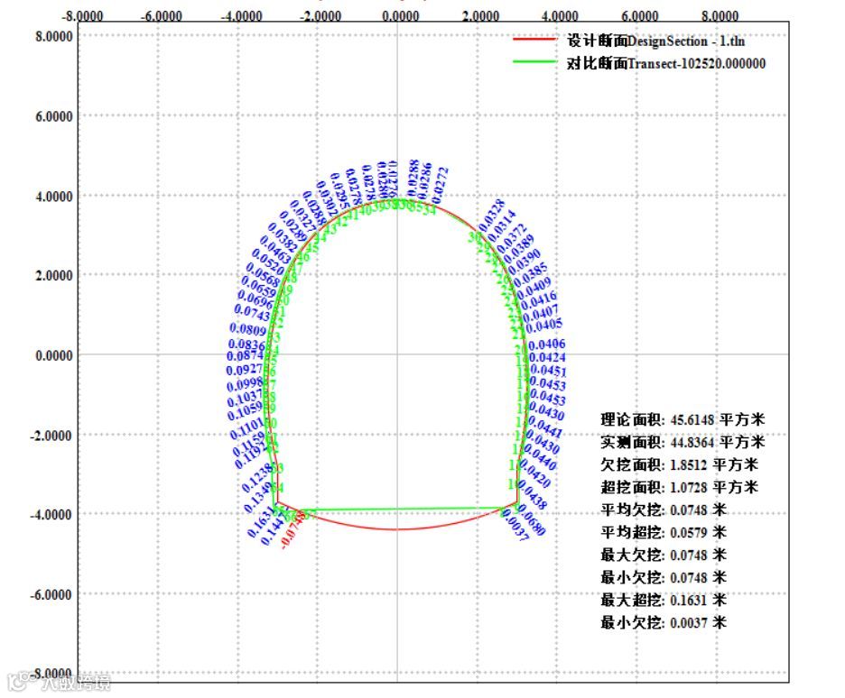 隧道施工中,超欠挖难以避免,开挖方量计算一直是测量的难点,常规手段存在量不准、量得慢的问题。徕卡三维激光扫描仪及配套的HDS隧道施工测量程序的推出解决了这一难题。通过隧道点云和设计数据比对,可以精确呈现隧道超欠挖情况,准确计算方量。
