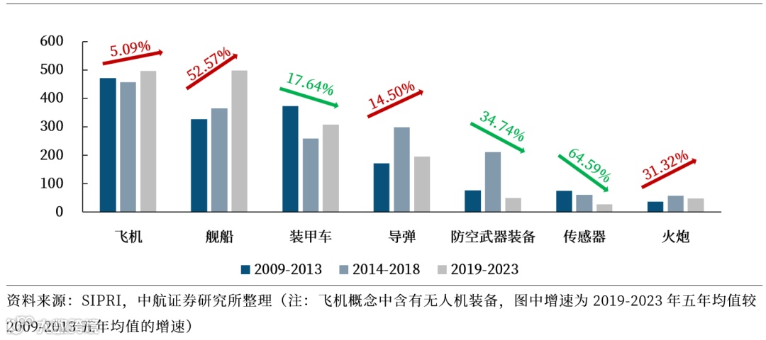 从我国具体出口的武器装备种类来看,2019-2023年,除装甲车、防空武器装备等占比较小的武器装备外,我国主要军贸产品的出口指标均出现了不同程度的提升。以2009-2013年为基准,可以发现,近年来增速较大且维持在高位的武器装备种类主要为飞机(含无人机)、舰船、导弹、火炮等“三航”(航空航天航海)装备。我们认为,一方面原因在于近几次信息化战争(亚阿冲突、以色列周边冲突及俄乌冲突等)中,无人机、导弹等具备较高效费比的武器装备得到突出体现;另一方面,从近年来珠海航展上亮相的各类出口飞机(含无人机)、导弹装备型号受到了客户的广泛关注来看,伴随我国“三航”装备技术发展迅速,相关军贸出口装备“物美价廉”的优势得到进一步巩固。