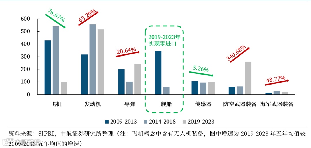 从我国近年来武器装备进口来看,以航空航天为代表的高端信息化武器装备进口量正在持续下降,其中舰船在近五年来实现零进口。伴随航空发动机国产替代的不断推进,我们预计当前占我国军贸进口比例较大的发动机领域的进口指标也将有望逐步下降。