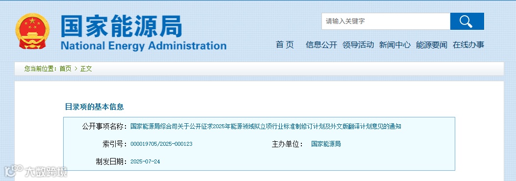 国家能源局综合司关于公开征求2025年能源领域拟立项行业标准制修订计划及外文版翻译计划意见的通知