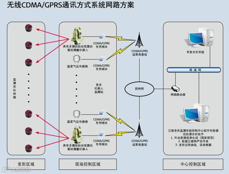 ④、通过Internet建立通讯链路。可分为有线方式和无线方式:有线方式是在测量机器人端连接一个调制解调器,然后通过网线或光纤接入互联网,同时将控制中心接入互联网,从而可以建立一个专用的通讯链路。该方式可以稳定、高效的实现远程控制和数据传输,并且不受距离限制,但是,实际的监测现场条件一般都比较恶劣,甚至是在深山峡谷之中,将网线或光纤接入到现场是不现实的。无线方式是在测量机器人端连接一个无线通讯模块(CDMA或GPRS或3G/4G),控制中心与具有固定IP地址的万维网连接,无线模块打开后,自动上线并且自动访问控制中心的固定IP,进而建立通讯链路。