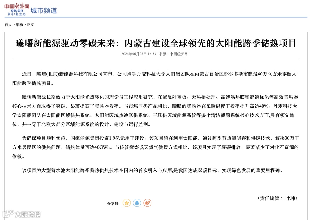 近日,曦曙(北京)新能源科技有限公司宣布,公司携手丹麦科技大学太阳能团队在内蒙古自治区鄂尔多斯市建设40万立方米零碳太阳能跨季储热项目。