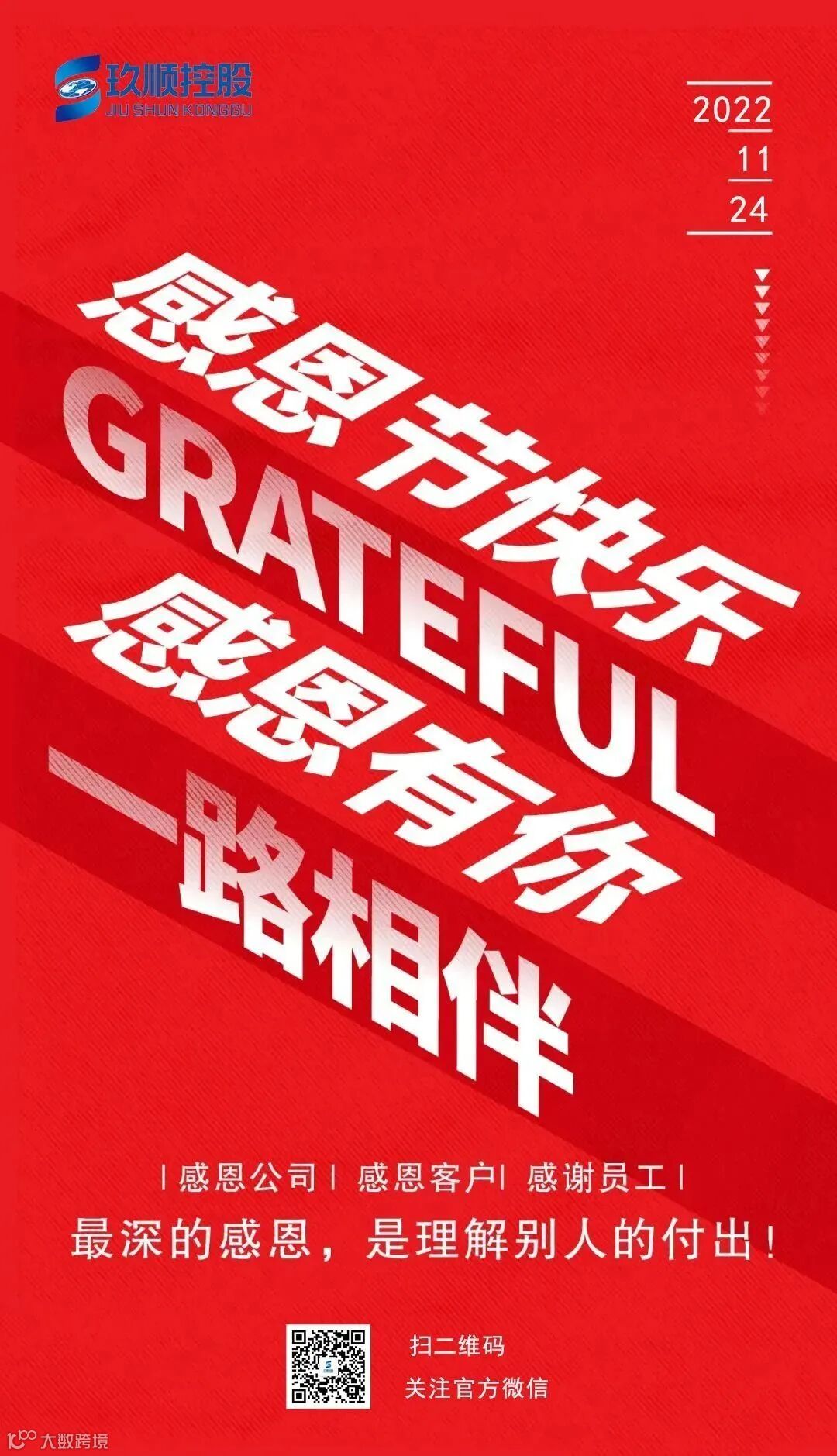 今天是2022年11月24号感恩节,广东玖顺控股有限公司,在此感恩广大客户伙伴一直以来对公司的支持与信任,感谢玖顺控股各位同事多年来与公司共进退,恪守职位勤勤恳恳默默付出。