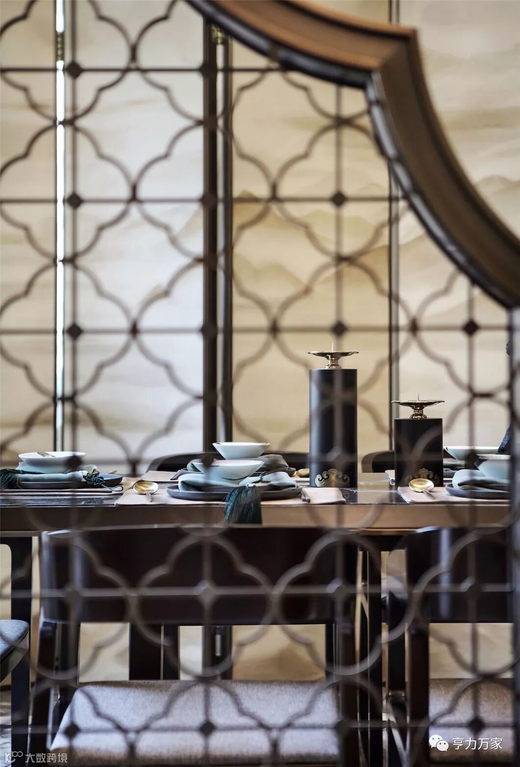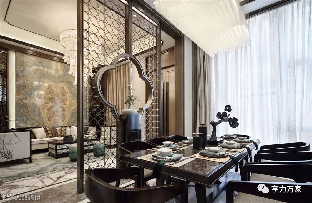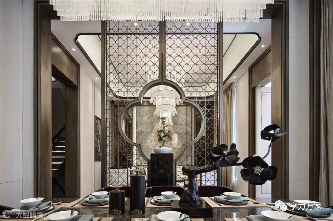 中式屏风的雅致,配合软硬结合的金属感线条,极富质感的餐椅和特色纹案的地板,让整个餐厅仪式感中不乏轻松和舒适。