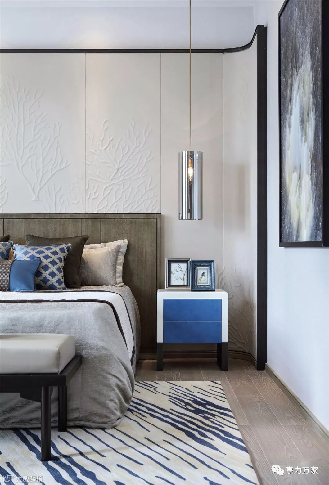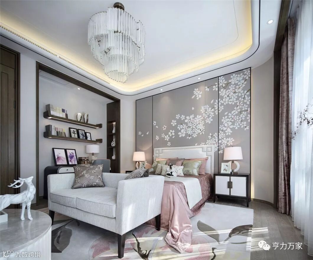 古韵新意,美境相连。主卧结合墙身硬包、天花嵌入的古铜不锈钢、艺术玻璃、皮雕和布艺,绝佳视觉美的背后其实是对设计师和施工团队的严苛高要求。