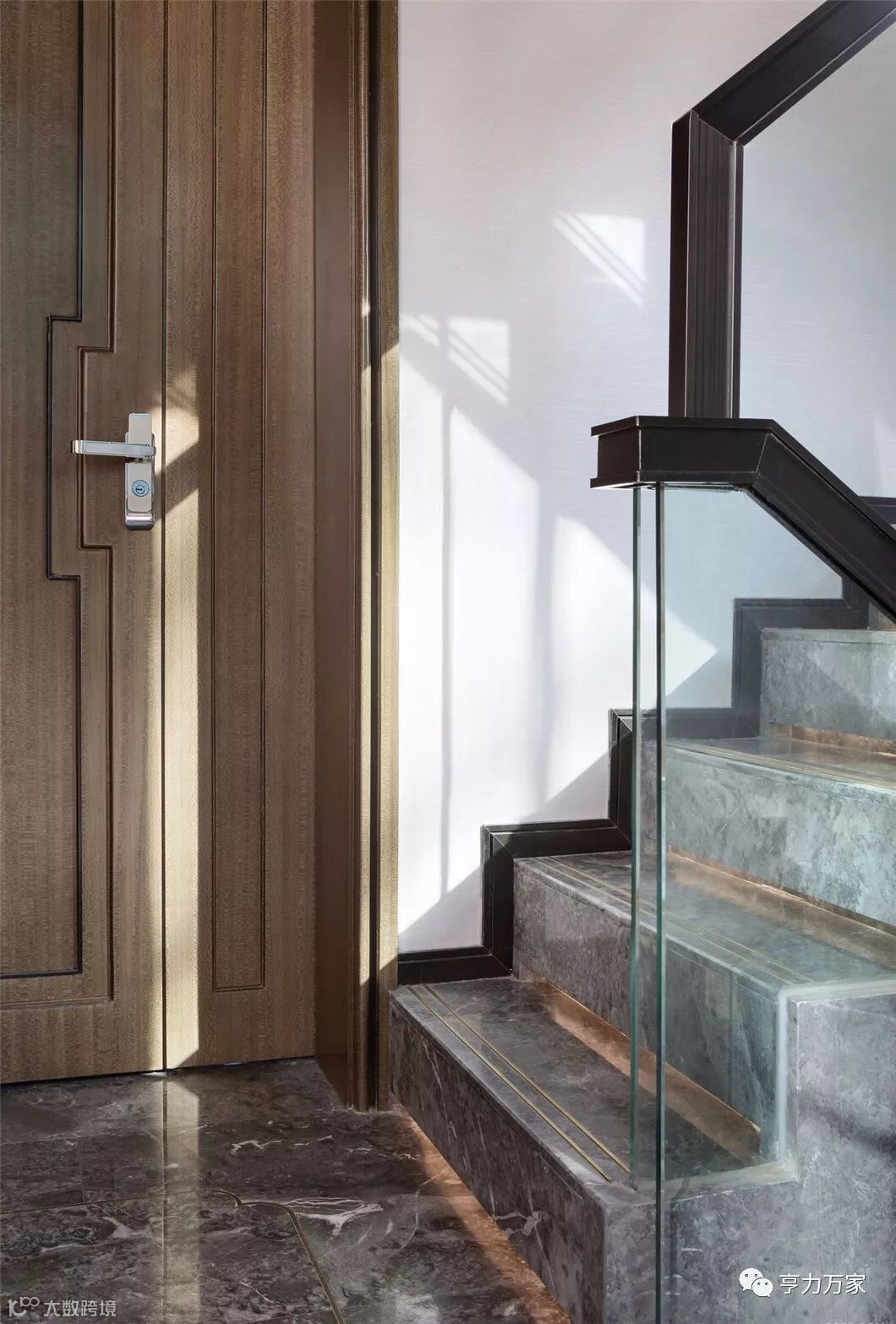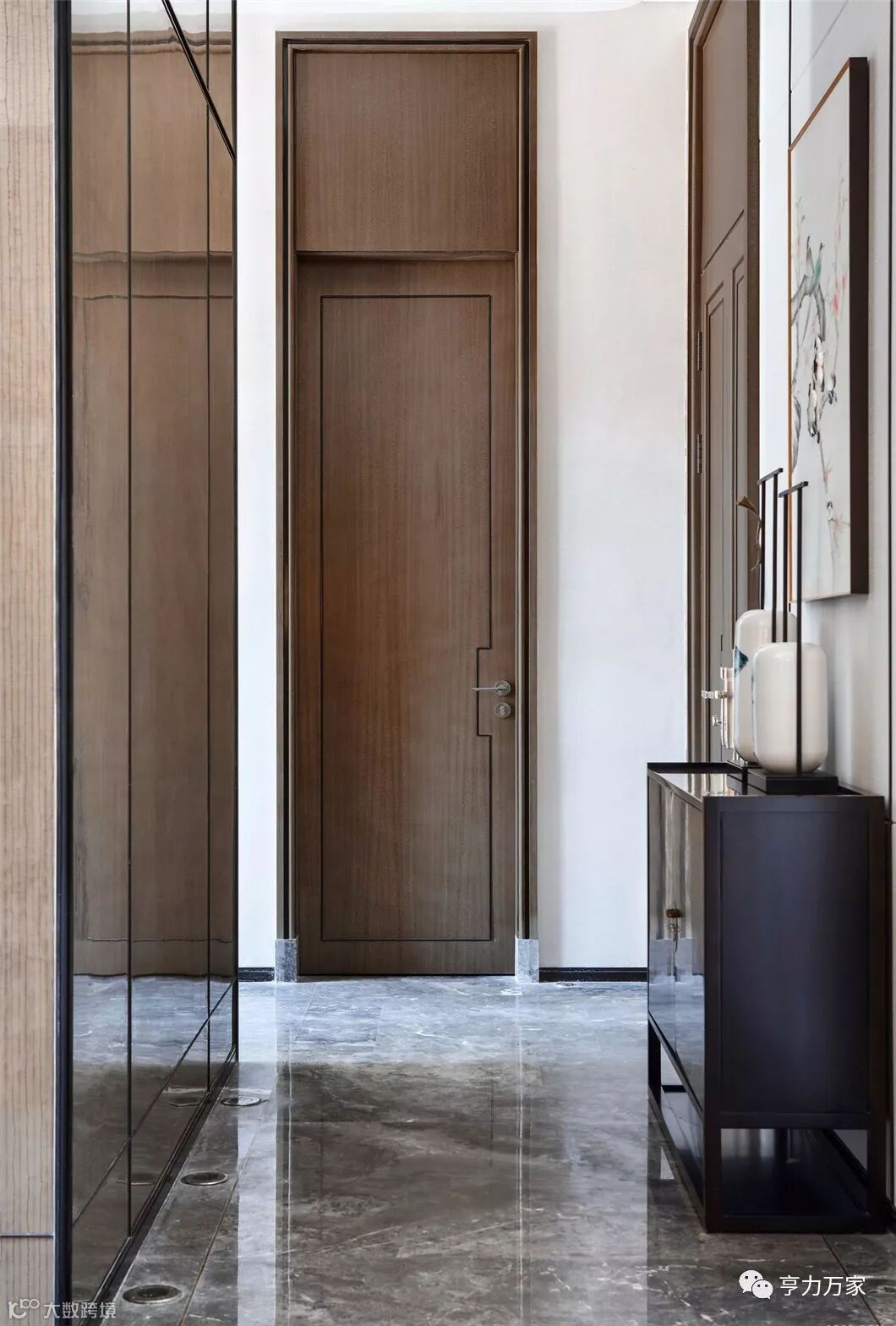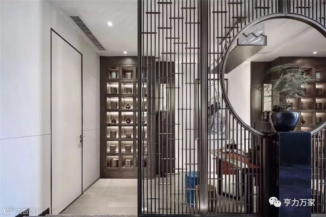 品酒区走廊采用现代屏风的形体在墙体大面积铺展,提取山水元素,通过空间的营造,体现主人典雅质朴、大方端庄的审美趣味。