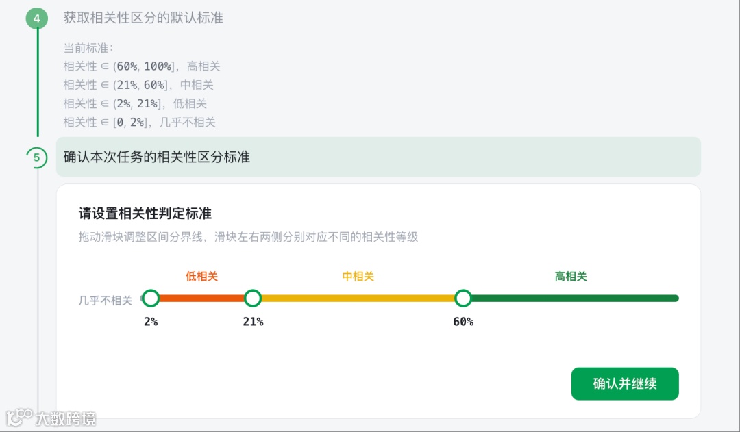 竞品池确认后,通过滑块调整相关性阈值。标准化产品建议使用默认值;配件类或类目边界模糊的产品应收紧标准,避免中低相关词过多增加筛选负担。