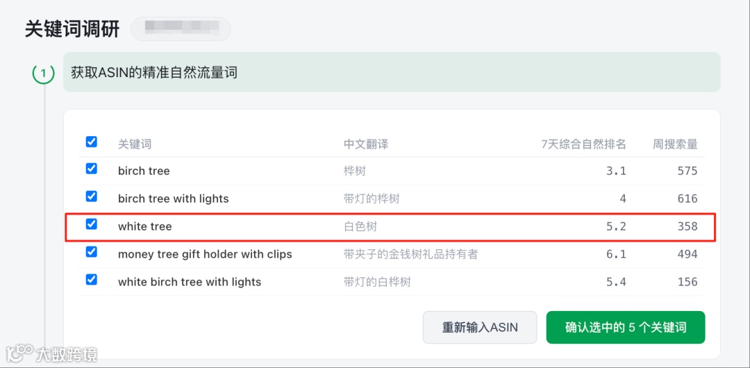 输入产品ASIN后,系统自动识别核心词。本例中,birch tree、birch tree with lights等词指向明确,但“white tree”意图过宽——搜索者可能寻找人造白色树或其他仿真绿植,与产品关联不足。保留此类词会导致竞品池泛化,进而污染关键词库。建议严格删除意图过宽词,确保核心词精准。