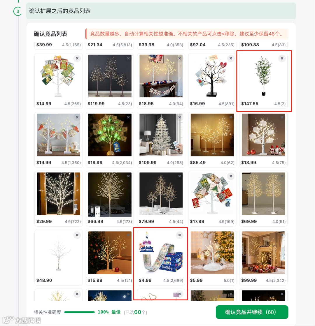 系统基于核心词扩展竞品池后,需剔除购买意图不匹配的产品。例如本案例中的人造桦树和生日礼盒:虽同属节日场景,但买家搜索意图、关注卖点及决策逻辑截然不同。混淆此类产品会使关键词边界偏移。务必确保竞品池仅包含直接竞争对手。