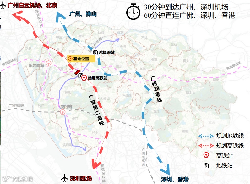 通过蛤地高铁站,直达广州、深圳机场,融入国家高铁网,实现对全国、大湾区长途客流的品质服务。