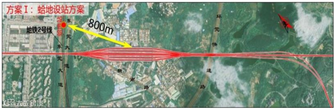 报告重点标出了蛤地设站方案的具体位置,离地铁2号线蛤地站约800米