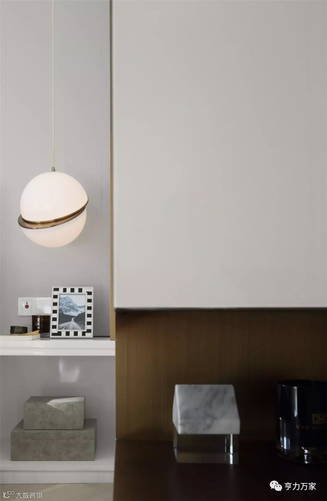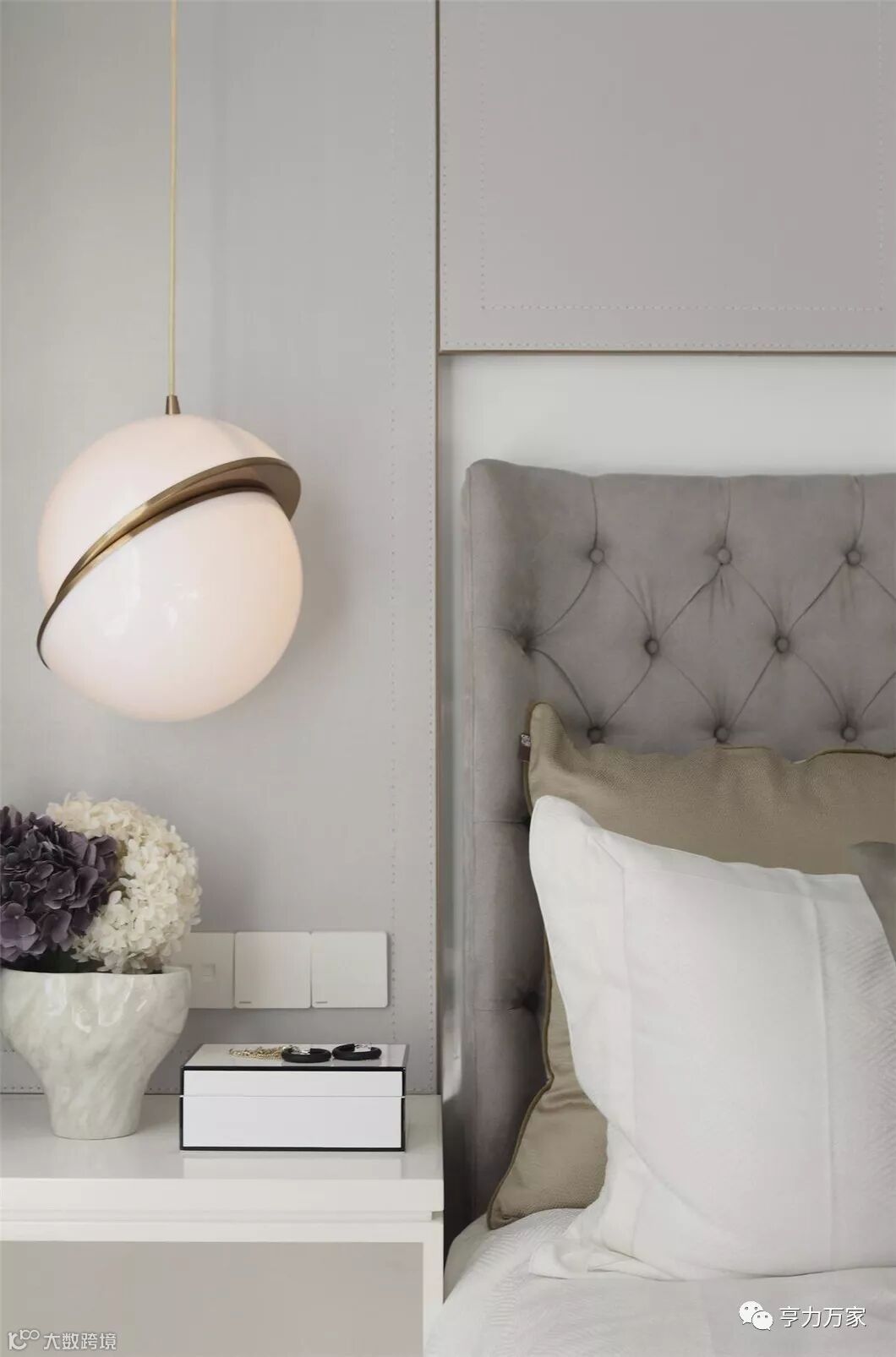 霜灰色墙体在光线下呈现出柔和的肌理,搭配隐约显露的金属光泽,氛围轻松优雅。一对寓意着永恒宇宙体的浑圆吊灯,照亮床头的亲密岁月,直线与圆弧,恰到好处的赋予了空间抽象理性与优雅感性的极简之美。