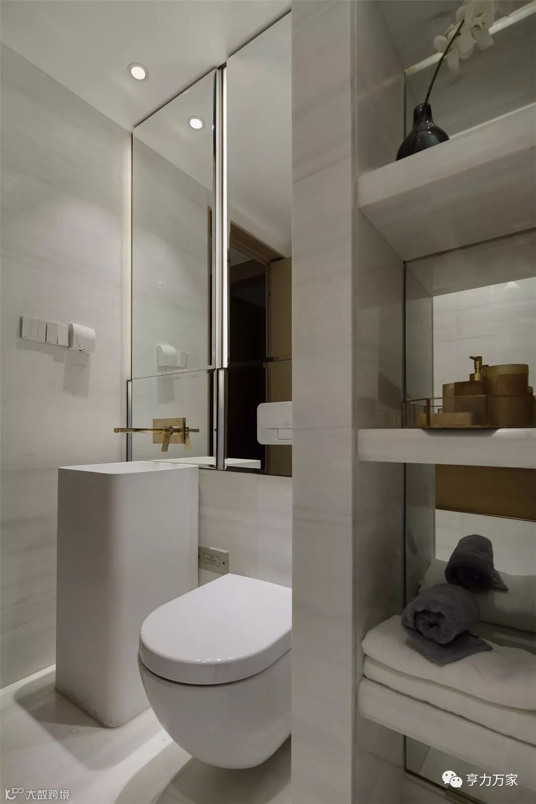 中国人骨子里是内敛的,哪怕是最不起眼的卫浴。素色如河流冲刷过的大理石四壁,隐藏在四方镜之后的储物暗格,配上极简的古铜色龙头点缀,丝丝入扣的阐释了这一空间的功能和性格。